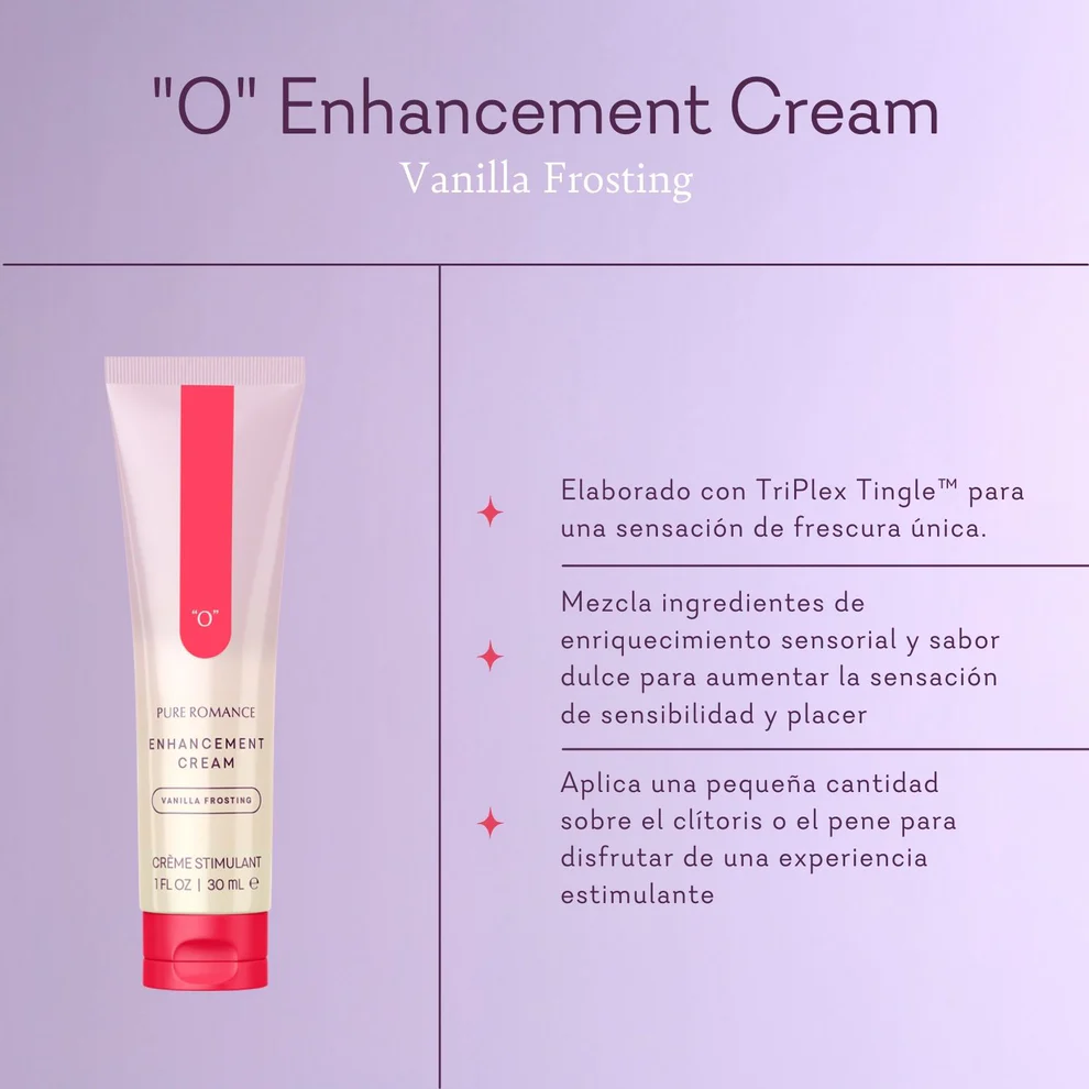 Haga que los momentos íntimos juntos sean inolvidables con la Crema de Realce “O”. Impulsada por TriPlex Tingle™ para una sensación fresca y estimulante, esta es la crema de realce más intensa de la línea Pure Romance. “O” combina ingredientes que enriquecen los sentidos además de un sabor dulce, aceites esenciales y mentol para ayudar a aumentar la sensación de sensibilidad y placer. Aplique una cantidad del tamaño de un guisante en el clítoris y/o el pene para que sea una noche de la que usted y su pareja no podrán dejar de hablar.